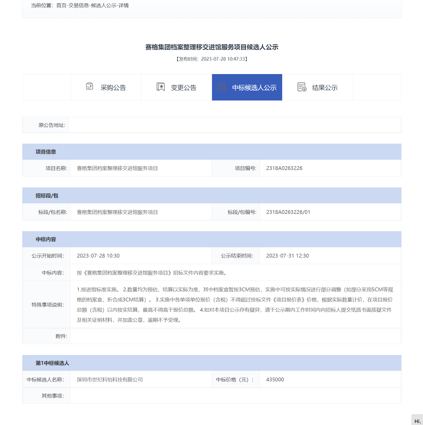 賽格集團(tuán)檔案整理業(yè)務(wù)包括:檔案整理約1600盒,錄入約31000條,數(shù)字化約384000頁(yè)。驗(yàn)收標(biāo)準(zhǔn)為成功移交進(jìn)館。