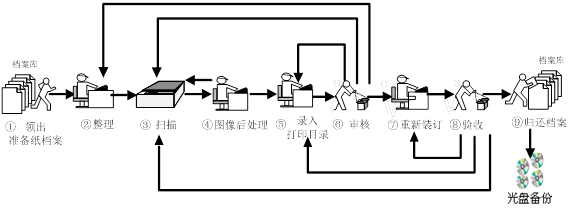 通過(guò)掃描的方法把以紙介質(zhì)為載體的文件資料由模擬信息轉(zhuǎn)變?yōu)閿?shù)字信息,并按一定的質(zhì)量要求對(duì)電子文件進(jìn)行加工和制作,然后存儲(chǔ)在磁盤(pán)或光盤(pán)介質(zhì)上,確保檔案電子圖像完整、清晰、無(wú)誤,保證圖像和檔案實(shí)體一一對(duì)應(yīng)。